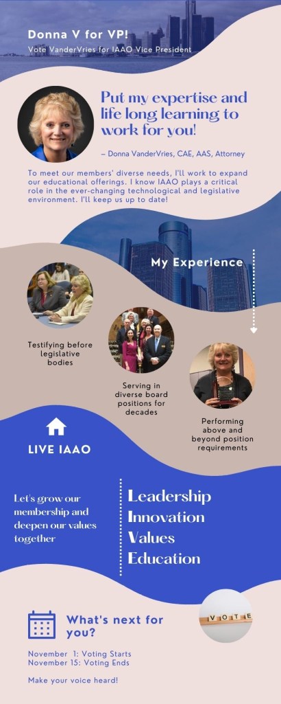 I respectfully request your support for IAAO Vice President. Let’s grow our membership and deepen our values together. My goals for IAAO include building toward the future by mentoring tomorrow’s assessors. I’ll support our excellent and affordable education programs – both in person and online. I’ll do all this while drawing on the expertise of our long term members. Together, we’ll strengthen our status as the world leader in mass appraisal while promoting diversity, equity, and inclusion in everything we do.